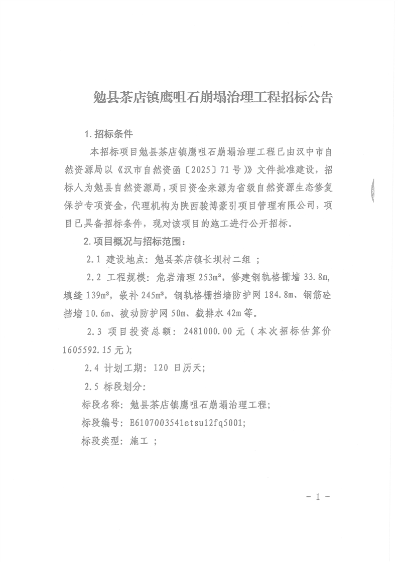 勉县茶店镇鹰咀石崩塌治理工程招标公告
