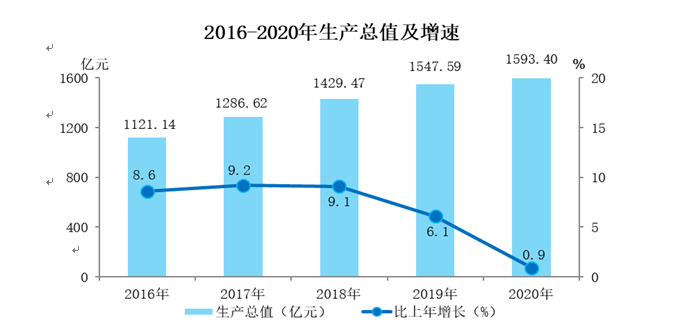 生产总值中,第一、第二和第三产业增加值占比分别为16.4%、40.3%和43.3%。与2019年相比,第二产业增加值占比下降2.5个百分点,第一产业、第三产业增加值占比分别提高1.7个、0.8个百分点。
