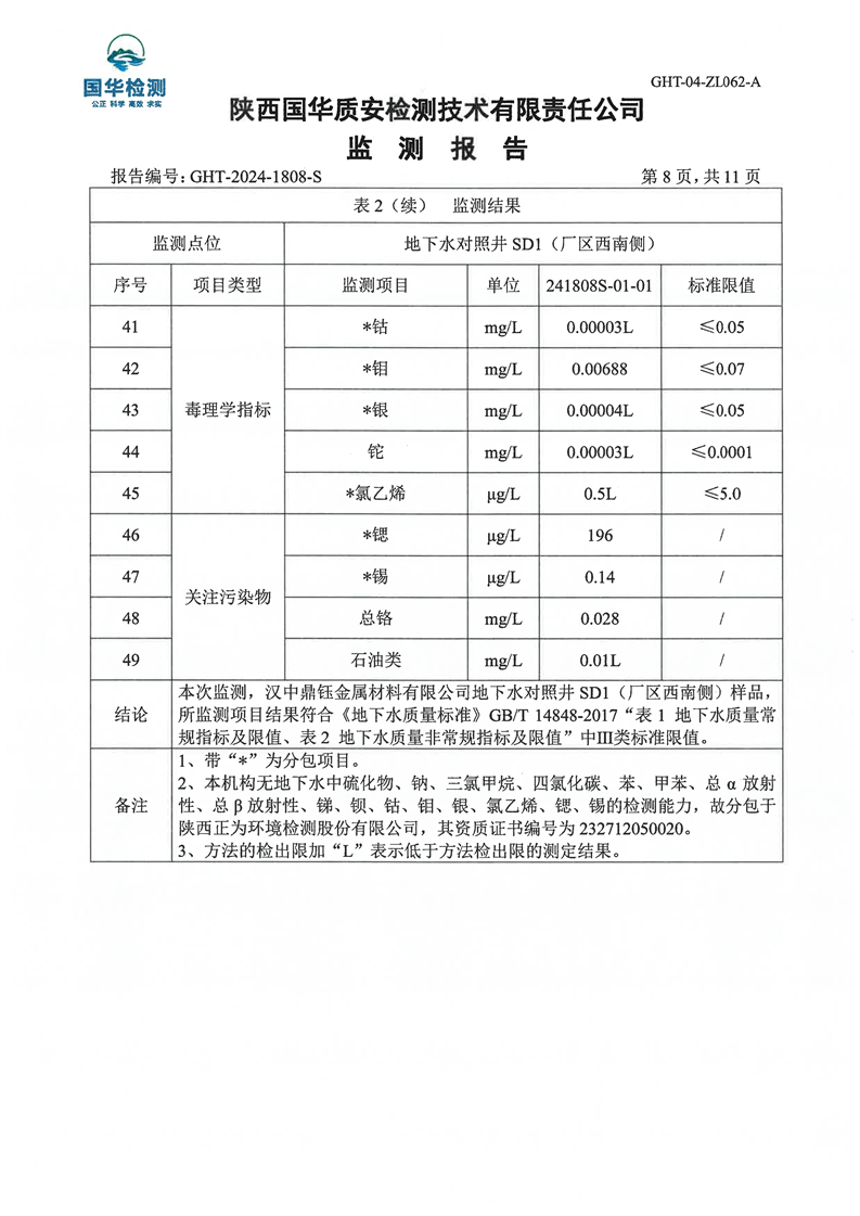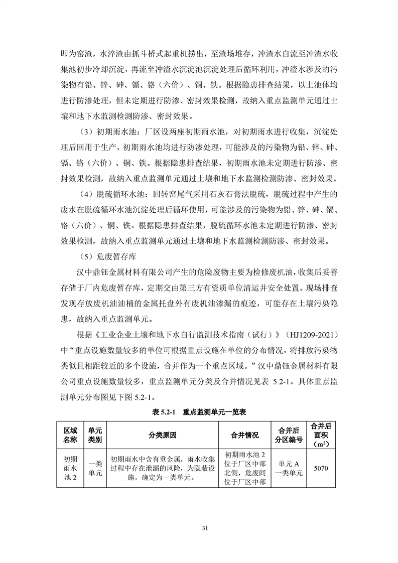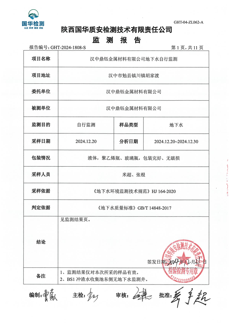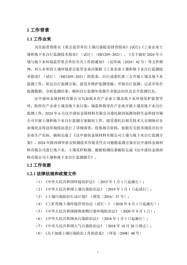 汉中鼎钰金属材料有限公司2024年度地下水和土壤自行监测报告
